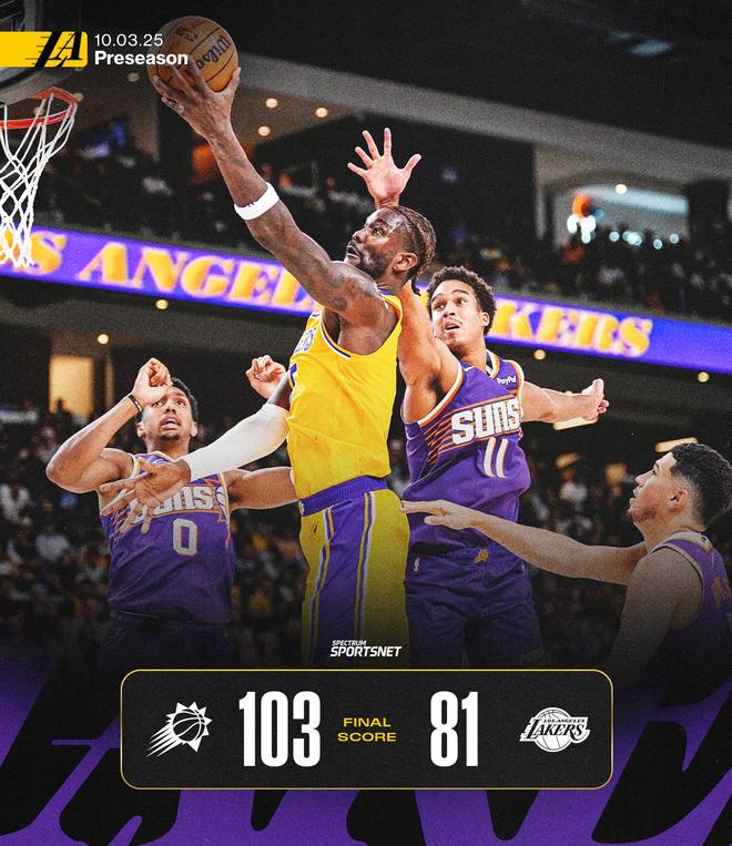 季前赛:詹姆斯东契奇缺阵,湖人91-103太阳,布朗尼12投1中