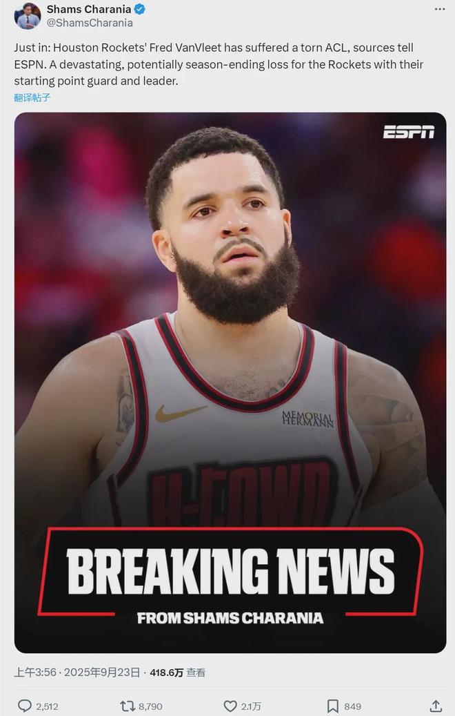 北京时间9月23日凌晨,据NBA名记Shams报道,火箭队后卫范弗里特遭遇膝盖十字韧带撕裂(ACL),下赛季很可能会报销,这对火箭来说是一个毁灭性打击。“毁灭性打击”这个词是Shams的原话,并不是教主自己瞎编的。